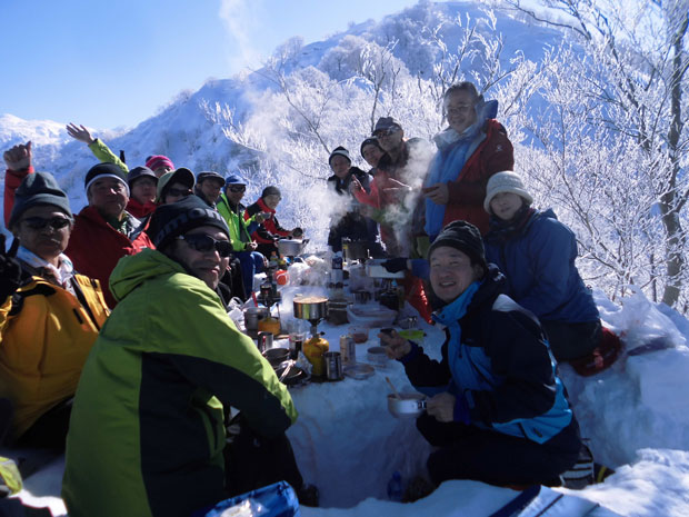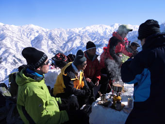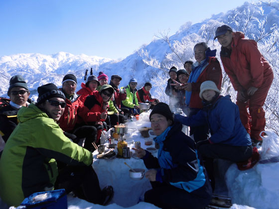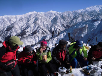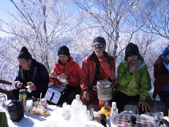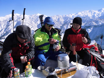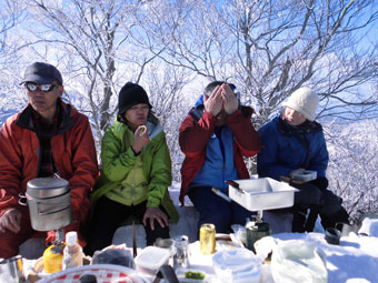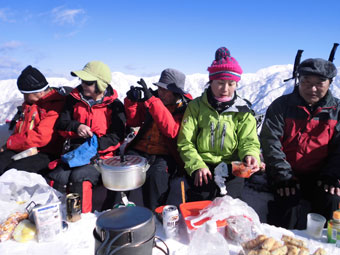 | 負釣山登頂を断念したが、展望の効く7合目での食事タイムは、とても和やかだった。 |