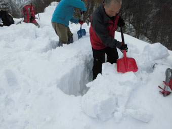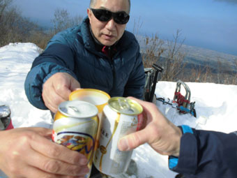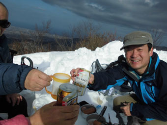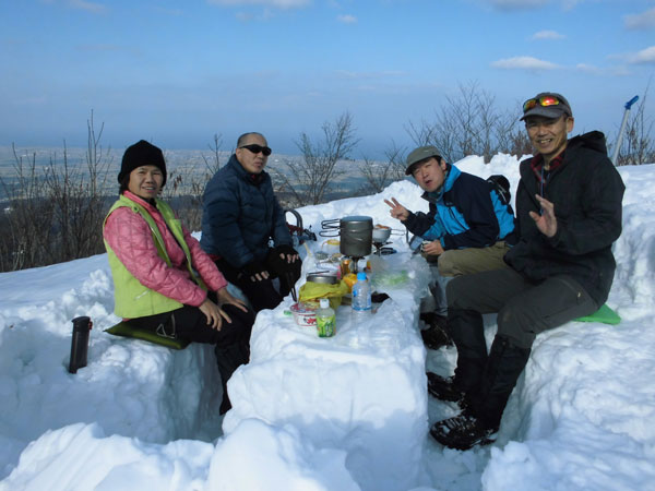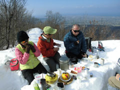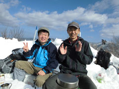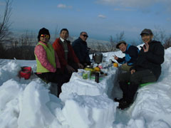| 山頂は、この程度の雪量であった。 | テーブル造りに精出すシュンちゃんと玉ちゃん。 |