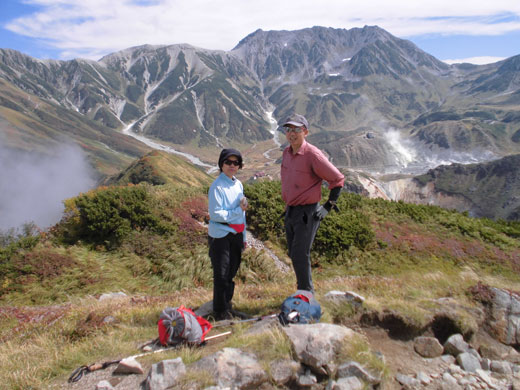 | ちょっと一服して、立山の稜線をバックに・・・ |