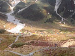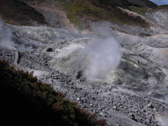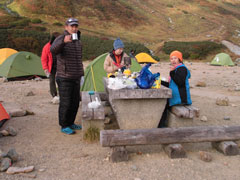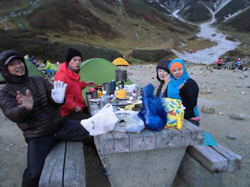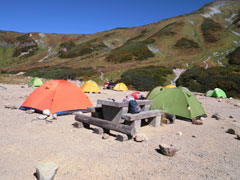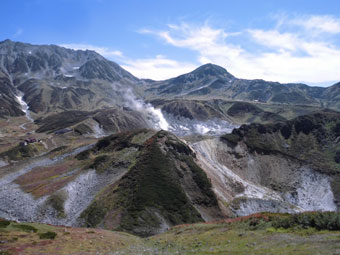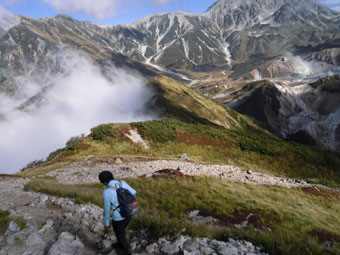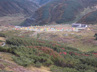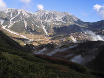 | 雷鳥沢キャンプ場と雷鳥坂・大走り | 地獄谷の噴煙。 | テントを張って、奥大日岳へ・・ |