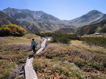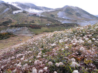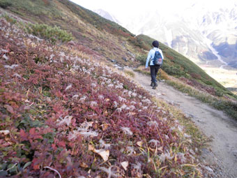 | 立山の稜線が、はっきりと分かる。 | チングルマを横目にしながら・・・ |