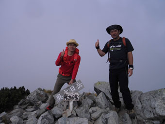 | ガスに覆われた奥大日岳山頂で・・・ | 山頂で、暫し語り合った成田氏(右)と山崎氏。 |