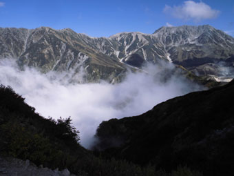 | 明日登る予定の立山の稜線を望む。 | 雄山・浄土山・地獄谷を眺める。 |