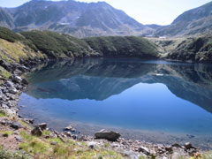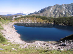 | 今日の目的地・奥大日岳を望む。 | みくりが池とみくりが池山荘。 | みくりが池に映る立山。 |