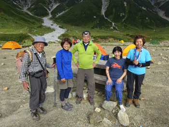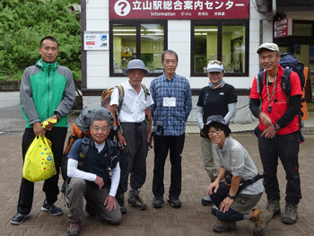 9/3 午前5時前に電話が鳴った。「私も同行したい。泊まるわけにはいかないが・・」 池田氏であった。賑やかになるから大歓迎! そして、皆との約束時間と場所を伝えた。待ち合わせ場所のアルペン村午前6時に、ねぎちゃんもやって来てくれて、いっぺんに盛り上がった。立山駅で池田氏と合流。そこに、イケさんとハマちゃんとバッタリ。こんな事は、なかなかないので、無理矢理写真に収まってもらった。