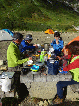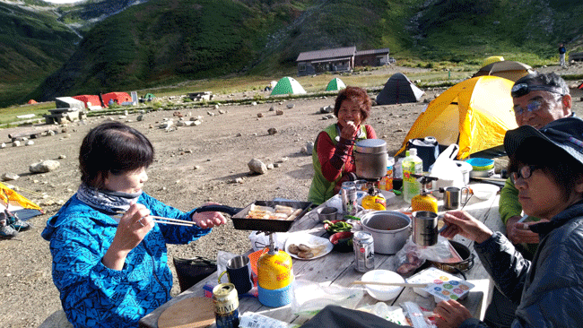 「先に行ってくれ。」 と言ったのかもしれないが、放って行ってしまうなんてとんでもないと思ってしまった。お腹も空いていたらしく、我々が、「食べろ!」 と言ったものを全て食べたような気がする。日本語は上手だったからか、泊まる所を見付けていたようで(雷鳥沢ヒュッテ)、我々一人一人に、ハグをして、灯りの見える方向に歩いて行かれた。