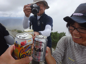 テン場発が午前10時55分。このような時間からだと、上昇気流の関係か剱岳を望める機会が少ない。しかし、あれやこれやと話しながらの歩きだから結構楽しい。時々であるが、剱岳の全容といかないまでも、姿を見せてくれたのである。でも、山頂では、真っ白でその姿はなかった。でも、泊まるのであるから、当然の事ながら乾杯である。