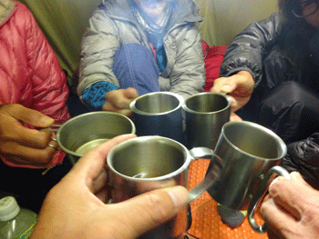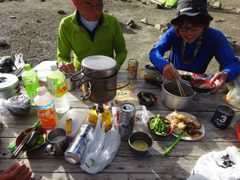 今回の楽しみでもあった宴会が始まった。例の如く、次から次と出て来る食材に、持参した物が、なかなか出せないというジレンマがあったが、もうどうでも良くなって、飲み物と一緒に、胃袋の中に流し込んでいた。歩いた後は、少々のアルコールを頂いても酔いは少ないように思う。何故なんだろう。アルコールは水分ではないハズなのに・・。
