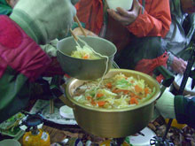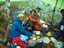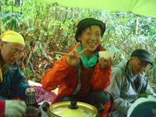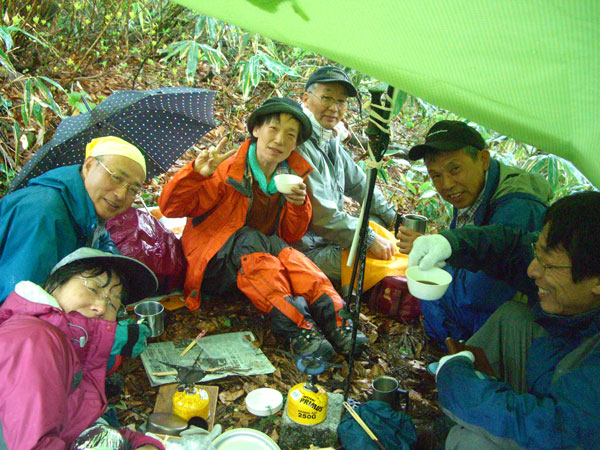 大平山に戻ったら、雨の中にタープを張って、それなりの宴が催されていた。雨の中でも、皆さん本当にいい顔をしておられた。運転手の伸子さんだけが寒い寒いと言って、宇宙服を着ておられた。ラーメンと山菜料理にコーヒーを頂いて、「やはり早めに帰らなくては・・・」 と後片付けもしないで、先に登山口へ向かわせてもらった。