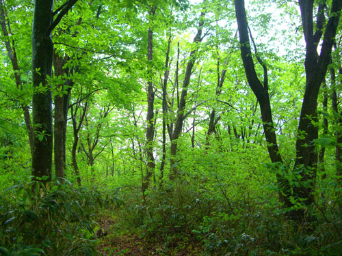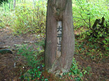 始めから雨であったが、登山道はしっかりしていて、「コシアブラがないかな・・・」 と探しながらでも、40分くらいで大平山頂に着いた。虎谷との分岐までは、何だかクマが棲みそうな所が何カ所もあり、一人ではあまり気持ちが良くなくさっと抜けた。虎谷との分岐の標柱が、クマの引っかけ傷なのであろうか、文字が見にくくなっていた。その先20〜30mくらい進んで、左へ上がらなければならないのに、まっすぐ行ってしまった。だんだんと降りて行くので、「これは可笑しい・・」 と引き返してよく見ると、小さな赤いテープの見落としであった。