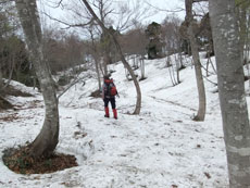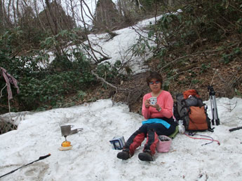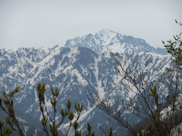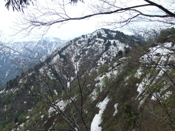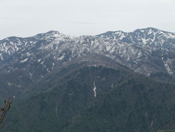 | 雪上をちょっと間違えて、正規ルートに戻る。 | 右奥が僧ヶ岳〜駒ヶ岳 |