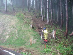 高度を500m程上げた標高770~80m所に、「登山口」と称した小さな標識が立てられており階段が続いている。