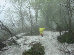 またまたずぶ濡れになってしまったが、杉の木の下で水分補給をして、すぐ下る事にしたが、“あの斜面を下るのが怖い。”と「山ノ神」が言う。“さーっと下れて速い。”と言ってもダメなのである。軽アイゼンを履かせ、下でフォローするからと言って降りる、我々山行の極当たり前のスタイルとなる。その斜面を下ると、そんな事があったのかと言った感じのルンルン気分の「山ノ神」のようであった。