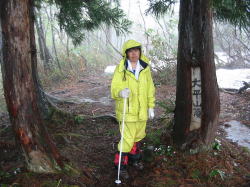 今日も最初から雨具着用である。短時間ルートと承知していたため、荷は全部私が背負う事にし、こっそり「山ノ神」用として、軽アイゼンをリックの中に忍ばせた。