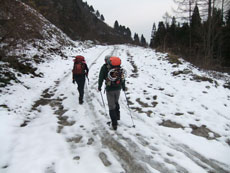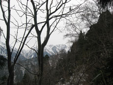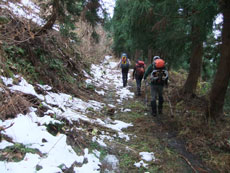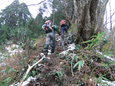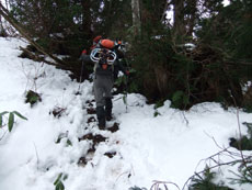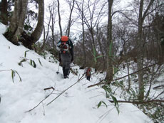 11/28 小又川左岸に来ると積雪を見た。担がなくてはならぬ時間が長いとみて、スノーシューではなく、カンジキを準備した事は正解であった。1250~1300m付近で、そのカンジキを装着したのであるが、結構小枝が煩く、「半ヤブ漕ぎだ。」 と言ってしまった。