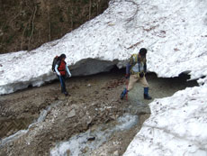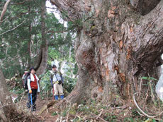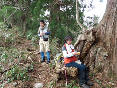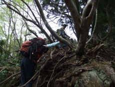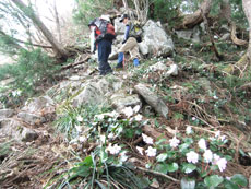 | 大杉の太さ確認のために・・・ | イワウチワが咲き誇っていました。 | 休憩場所を探すのも大変です。 |