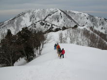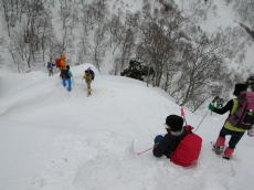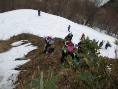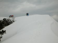2時間以上を宴会に時間を費やしてからの出発であった事や、体調不良者がいた事、もう一つは、地形図を途中風に飛ばされてしまった事など、不安要因がいっぱいあった。それでも、「行こう!」となったのは、先行者が夏道と違ったルートを行くと言っていたものの、山の精通者のようであった事と、トレースがはっきり残っていると思っていたからである。