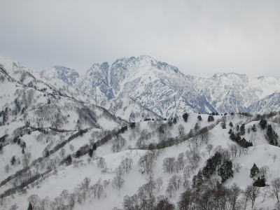 土倉山登高時は青空が広がっていたのに、昼食の頃から、日が陰り白黒の世界になってしまった感じであったが、展望がよく、剱岳や毛勝の山々の形が少しづつ変わって行く様を楽しみながら、止まってはシャッターを切っていた。