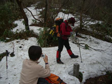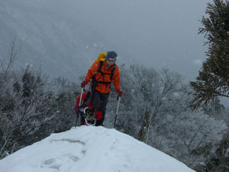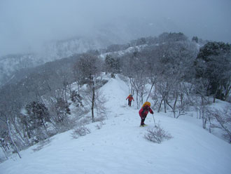 やはり標高800mくらいから、少し雪が現れ、カンジキやスノーシューを必要としたのは、稜線(1000m超)からであった。トーレスが高温で崩れ、それに昨夜来の降雪が乗った感じで、あまり美しい雪の状態ではなかったが、「冬のなごり」、そして、「春への息吹」 をマッチした、それなりの雰囲気を漂わせるものであった。