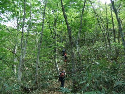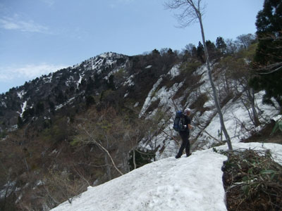 5/9 林道(桑首林道)には雪が無く、標高1,000mの稜線までも殆ど雪がなかった。「ピッケルもアイゼンも、そして、スノーシューもカンジキもない山行は、久し振りだね!」 と、いつもと違う雰囲気に落ち着かないようであったが、それはそれで、結構楽ちんであった。