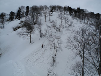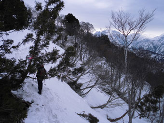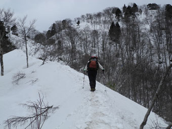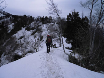 | いつもなら、戦々恐々とする細尾根の核心部。 しかし、今日は何の問題もなく通過。 |