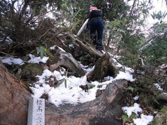 | 標高1、200mの標識超え・・・ | 剱岳が見え隠れする。 |