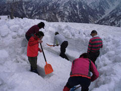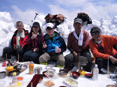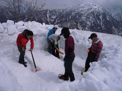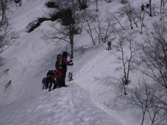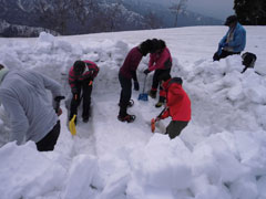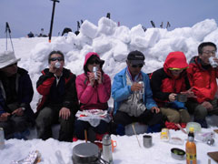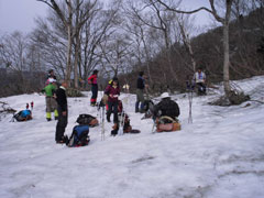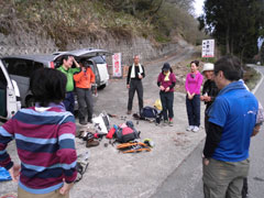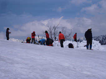 山頂に着いて、早速、ベンチ・テーブル造り。画像に載っていない人は、サボりです。