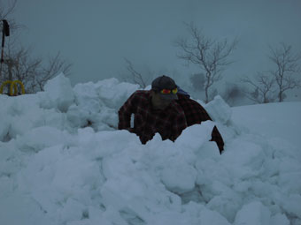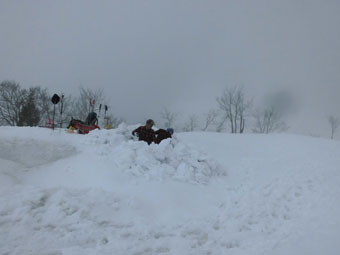 大倉山頂に立てば、相変わらずと言えばいいのか、大きな穴を掘ってしまう。深く掘れば、少々風が吹いても、寒くはない。ところが、舞うというより、パラパラという感じの雪が降ってきた。今日は、3人ともカップ麺だったし、コーヒーを頂いて、早々と退散する事になった。