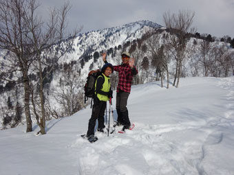 4/4 大倉山・桑首林道の入口に来て唖然。昨年は一週間前に来ているが、登山口近くまで車を乗り入れる事が出来たのに・・。でも、林道歩きは、ある程度想定していたから意欲は満々。先の寒気のせいなんだろうか、「4月上旬には、雪が消えていそうなもんだったが・・」 カンジキにしようか、スノーシューにしようかと迷っていたのに、すぐにスノーシューという事になった。