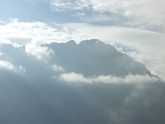 後を気にしながらの歩きでも、2時間掛からずして、猫又山に到着したのであるが、猫又山は初めてと言われる北野氏は、ガスに覆われていても、カール付近の雰囲気を察知してか、「何と良いところですね。」 と言っておられた。ぽつりと来ていた雨が、ブナクラ峠を過ぎてから、雨具を着るような雨に変わった。