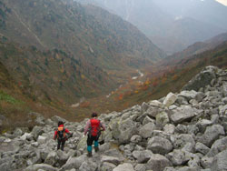 | 剱岳と対峙しながら、食事処を求めてカールを降る。 |