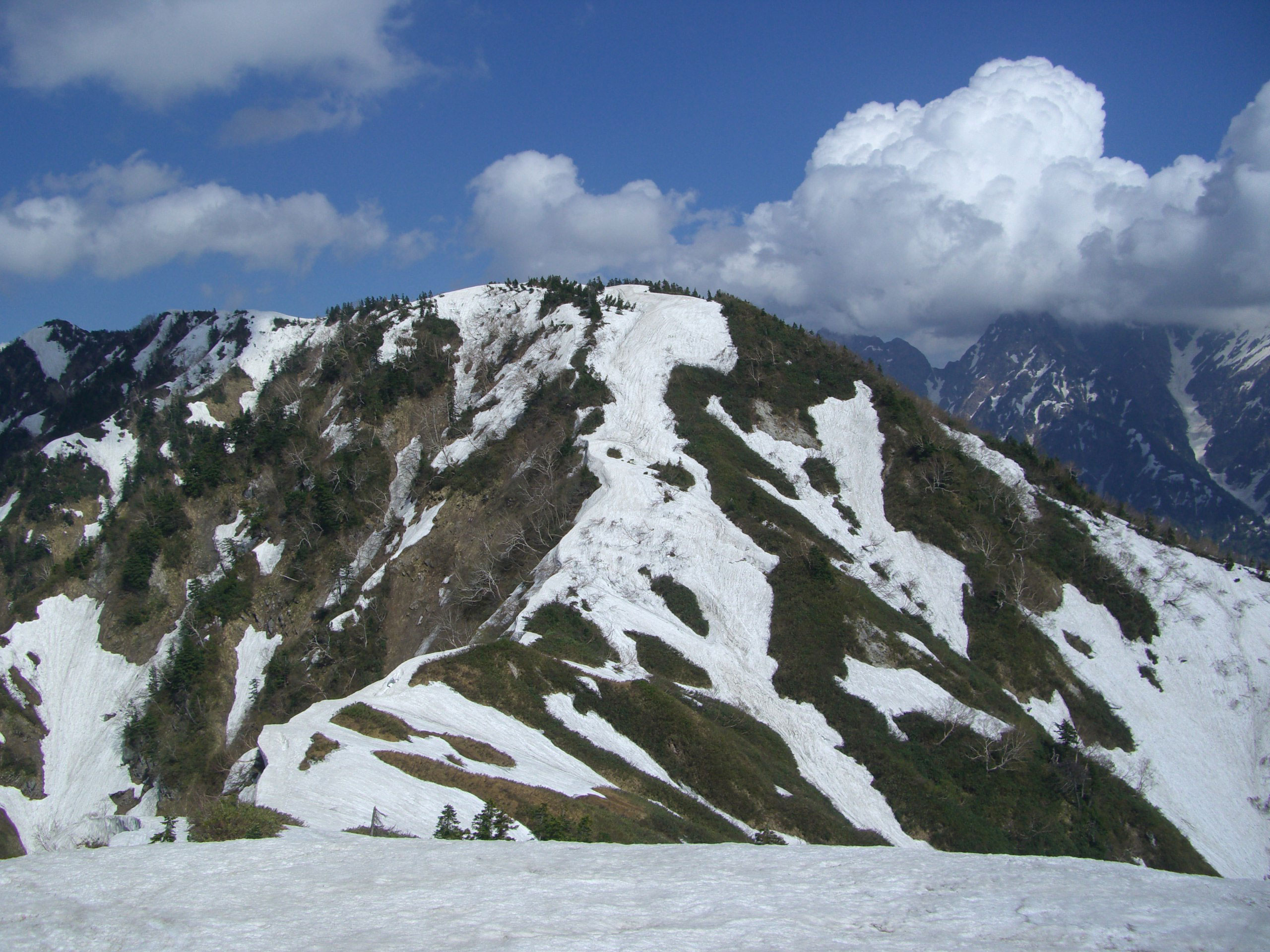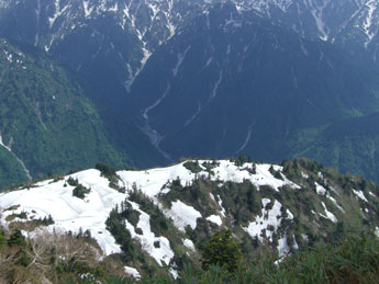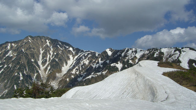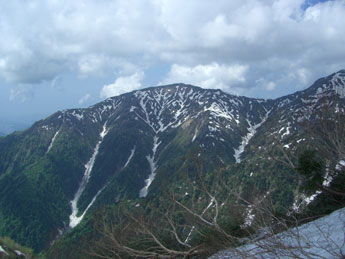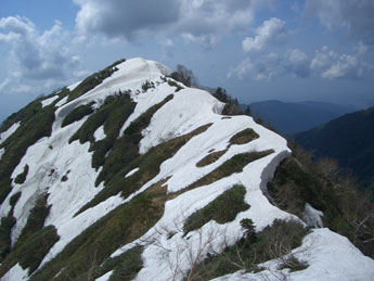 | 釜谷山・大明神山 | 稜線だけに雪が連なっている。 |