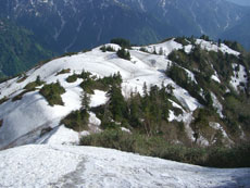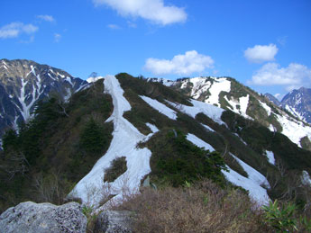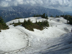 | 大猫平の様子が少しずつ変わって行く。 | 鬼場倉ノ頭の先の稜線。 |