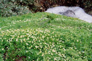 昨夏完成したこのルートは、今年は未だ登る人も少ないと見えて、踏み跡がわからず、ところによっては、目を瞑ってお花を踏みつけなければ前に進む事が出来ないほどであった。ガスが漂うと、低木に目印の布切れが結んであっても、初めての者にしてみれば、不安いっぱいの風衝草原である。大猫平から山頂に向かっての急登は、草地のトラバースもあり、手がかりがなく、決して登り易いものではなかった。でも、ガスの切れ間から見下ろす大猫平は、紅葉時には素晴らしい景観を約束してくれると確信した。稜線に出てからは、ササとチングルマ、ハクサンコザクラが入り混じってその草原が西にのびている。