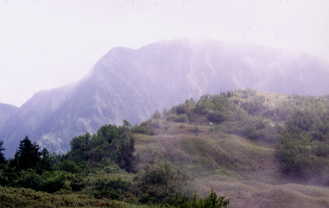 一回目は、暑い暑い7月23日で、私が車を止めた前が取付きだった。何も標識がなく、平らな石に赤い矢印があるだけで、すぐ急登が始まる。「こんな道をよくつくったものだ。」と思いながら高度をあげていくに連れ、雲の中に入っていくような感じで、期待している山並みがだんだんと見えなくなっていく。