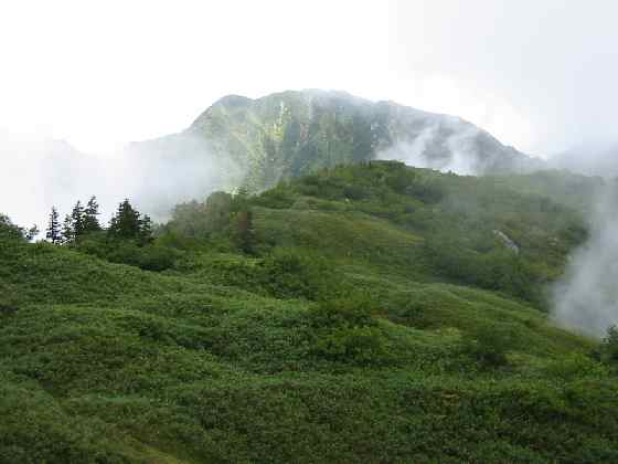 ■ 一瞬ガスが切れて、毛勝三山の最高峰「釜谷山 2,415㍍」が顔を覗かせた。山頂の風衝草原の上に、ぽかっりと浮かび上がった感じだが、右にある猫又山は見えない。 その猫又山までは、この東芦見尾根を辿れば行けるのであろうが、無雪期は結構ヤブが煩いのだろうか、私は未だ知らない。 片貝川南又谷から、「猫又山・釜谷山」に登ったのが懐かしい。その後何度となく、この「大猫山」と「鬼場倉ノ頭」を試みようと思ったが、南又谷入口ゲートの錠が頑なに閉ざされて、容易に受け入れてくれなかった。 昨夏、ブナクラ修復グループによって、切り開かれた登山道のお陰で、難なく剱岳の大展望台に立つ事が出来るようになった。・・・・・・・・・・