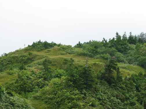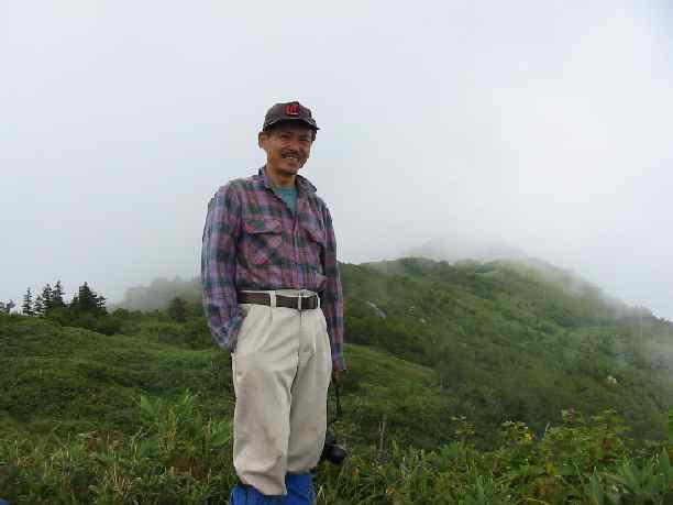 5回目の山頂は、昨年10月に登った以外は、全く剱岳を仰ぐ事が出来ない。今日も標高1500㍍まで、ほんのチョット“てっぺん”の山容を見せてくれただけで、涼しい以外は何の楽しみもない。しかし、独特の風衝草原の様相を呈している山頂周辺は、ガスに覆われているというものの、それなりの雰囲気があるものだ。福光から来たと言う中高年男女7人グループは、“ここが頂上ですか?”と私に尋ねて来た。そう言えば、登山口で、赤谷山にでも行くのかと思っていたグループが、取水口の階段を再び降りて来て、「大猫山」の登山口を探していたグループだ。彼らは矢継ぎ早に宴会を始めた。