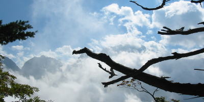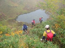 小雨の中の出発! 始めから急登! 15分も登れば客人達は雨具を脱いだ。まあ~、雨具を着ていてくれたお陰で雨が上がったのかもしれない。30分程で休憩しようと思っていたが、皆意外と強そうなので、もっと先に引っ張ってしまった。ゆっくり亀のようになどと言いながら、実はその速さがわからない。チョット休んでの会話も結構楽しいものであるから、ポイントに行かなくても適当に休むべきなのであろう。