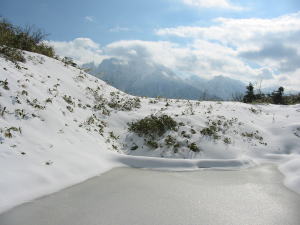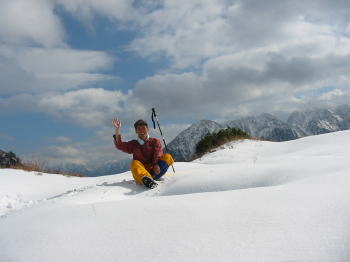 大猫平の積雪は20~25cm程度。 吹き溜まりは、もうチョット多いかも! まだ陽は差していたが、徐々に雲が湧き上がって来ている。 剱岳の本峰は依然と姿を現さない。後立山の五竜岳は全容を見せないまでも、何とか形で分かる。鹿島槍ヶ岳は、全くその形を見せてくれなかった。 池(地塘)を入れるために、そっくり返って撮って見たが様になっていない。 大猫平には、黄色の小さなテントが一張あった。山頂にでも出掛けたのであろうか、ひっそりしていた。