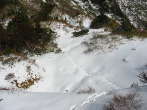 1425mから雪が現れた。雪量が増えて行くと、かすかに足跡が確認出来る。しかし、その足跡に新雪が覆い被さり、昨日のものだと思われた。1500mのポイントを過ぎて25分程経った頃、突然ガサガサという音にビックリしたら、上から男性が一人降りて来られた。思わず「あちらからですか?」と尋ねると、「昨夜は上で泊まった。」の返事だった。「昨日は撮れましたか?」の問いには、「夕方チョット!」であった。その方も、「朝はダメなんですよね!」と悔しさとも取れる顔付きだった。大ブナクラ谷の残雪期のルートも話題に!