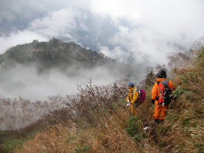 下山時ガスの合間から望める大猫平を見下ろしながら