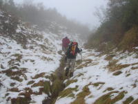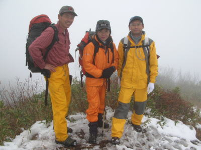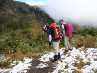 しかし、チョッピリしか積もっていない雪のため、大猫平のぬかるみは、ズボンの裾を汚すほど歩き難いものであった。期待した山頂は全くのガスの中で、大型カメラを持参した「ねぎちゃん」が落胆するほど一度もシャッターを切らせて上げる事が出来なかった。