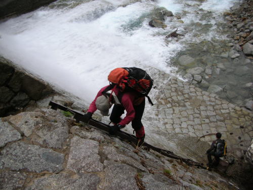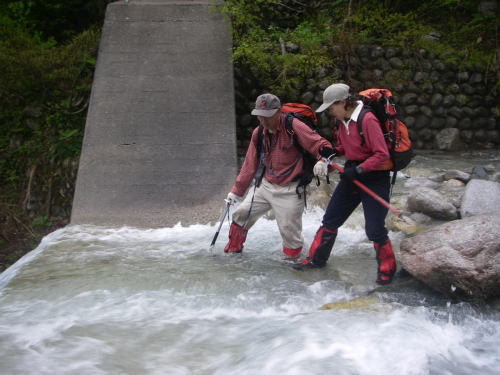 通常の鉄橋が架けられておらず、ブナクラの水量に、少々びびったのであるが、スイスイと渡渉して行く長勢君を見て、我々は、あっけにとられてしまった。馬場島から片貝・南又まで車を回してもらったのは言うまでもない。