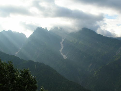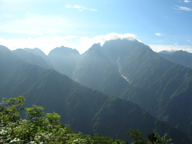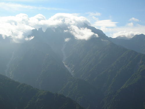 1500m付近に来ると、厚い雲に覆われていた剱岳の稜線が、浮かび上がり、 左から強い光を帯びて、異様な雰囲気の山となった。 |