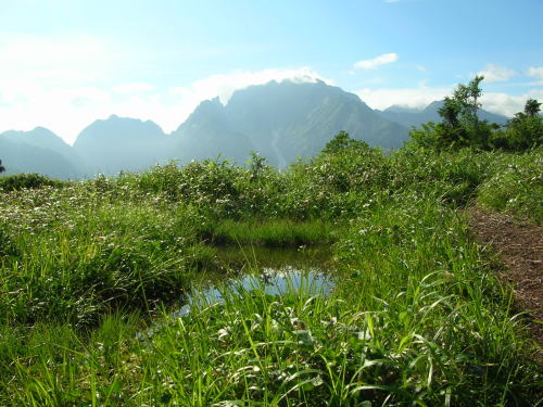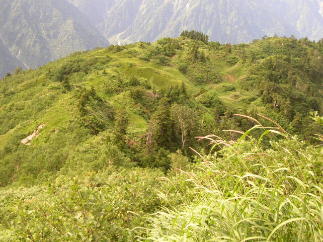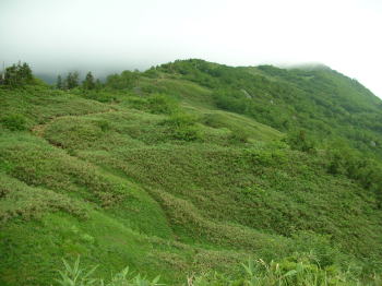 大猫平に入る前から、本峰に、少しガスがかかっているものの、 全容を見せてく れるようになった。 しかし、何度もシャッターを切ろうと思ったが、またすぐに、頭を隠してしまった。 |