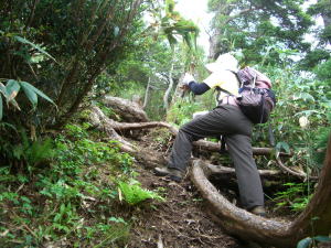 | 岩と根っ子の急登を過ぎるとロープが下がっている | 大猫平のお花は、まだ早く残雪がある | 「おおねっこやま」 の所以である |