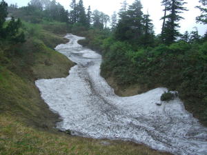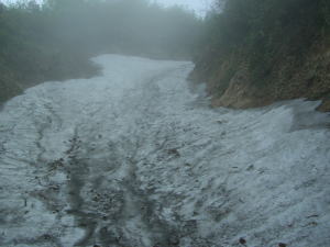 | 池(地塘?)は、残雪に覆われていた | 大猫平で、独りゆっくり食事を・・ | 急な下りは、結構足に堪える |