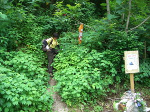「山ノ神」の所用がある為、午後4時過ぎまで、帰宅しなければならぬ条件下 の元での大猫山行。 1400mのピークまでは、大日連山をはじめ、展望がよく、剱岳も逆光ながら、 眩しい山容を見せてくれ、ワクワクしながらの登行であった。 1500mのピークに来ると、全く何も見えなくなってしまった。 大猫山でのよくあるパターンである。 元々、大猫山を苦手としている「山ノ神」であるから、展望がないとなると、 大猫平で戦意消失である。 「時間もないことだし、あんただけ、行って来られ・・」 いつものパターン。 |