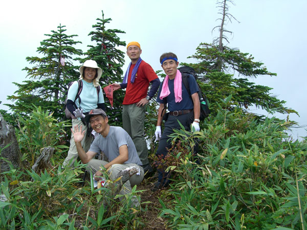 我が家の事情(脚力)で、ゆっくりという手加減(足加減)を頼んだのであるが、やはり元気が余る人達には、ゆっくりにも程度があるようだ。4時間も掛からずして山頂に着き、猫又山側に少し(10分程度)移動して、ペコペコのお腹を満たすための昼食とした。