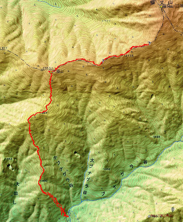 ブナクラ取水口7:00=1500mP(8:35~45)=大猫平(10:00~05)=大猫山頂上11:00=昼食地点(11:10~13:15)=2190m地点14:05=大猫山頂上15:00=大猫平(15:35~40)=1500mP16:50=登山口17:50